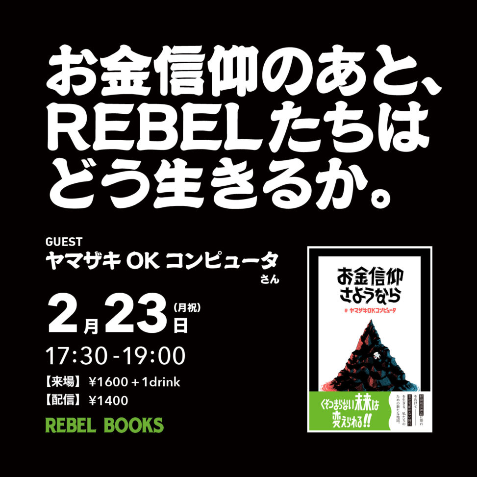 レベルブックスで170冊以上売れて投資にまったく興味のなかった人たちの先入観を大きく変え、地元の個人店を愛しながら生きている人たちに「我々こそむしろ投資をすべきでは」と思わせた、『くそつまらない未来を変えられるかもしれない投資の話』の著者であるヤマザキOKコンピュータさんが、その先の未来を考える新刊『お金信仰さようなら』の刊行を記念してレベルブックスに登場。当店の店名を踏まえ、これからのREBEL(=反逆者、反抗者の意)はどう生きていくのかを、いち早くお金信仰に別れを告げて新しい未来を生きている人たちの例を引きながら一緒に考えていきます。